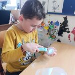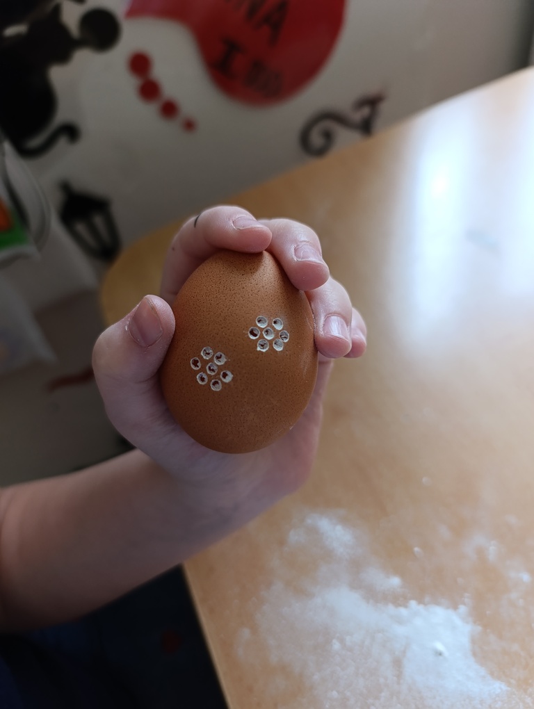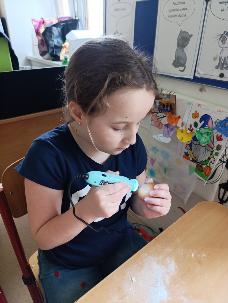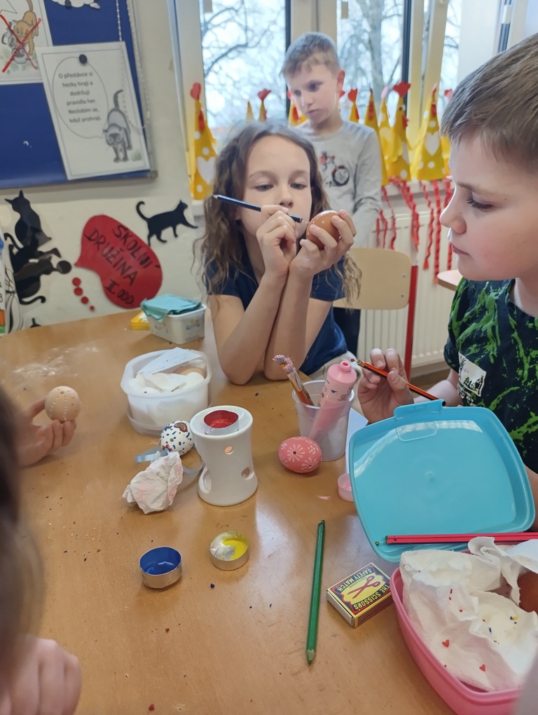 V družině jsme s dětmi z 1. a 2. třídy zdobili velikonoční vajíčka technikou brusky a vosku.  Pomocí brusky děti mohly vajíčka ozdobit dírkami, srdíčky  a vytvářet zajímavé vzory. Poté je dozdobily voskem pomocí teček a čar.
