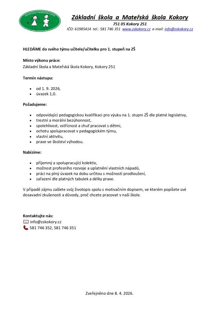 Hledáme učitele/učitelku pro 1. stupeň ZŠ